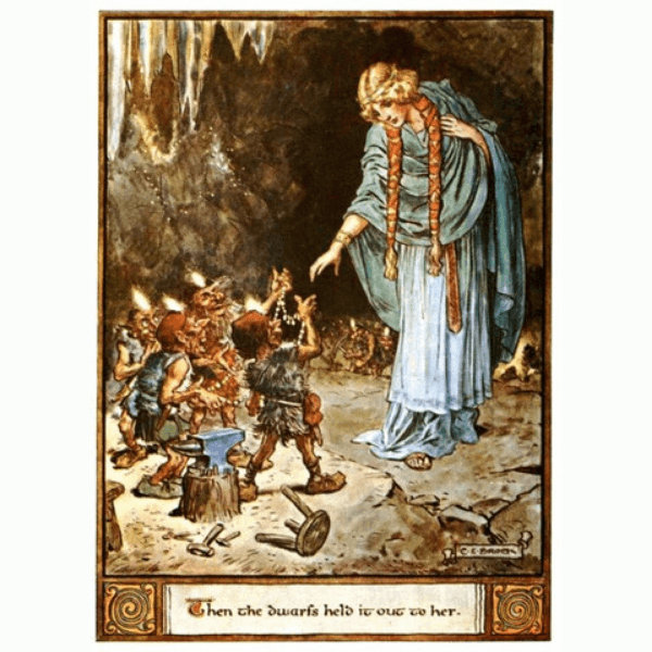 Freyja was the goddess of love and sexuality in Norse mythology. Most of her explicit songs had been censored. According to the myth, four dwarves named Alfrigg, Berling, Grerr, and Dvolin make a magnificent necklace. Freyja enters into a tough and long negotiation with the dwarves to acquire the necklace and decides to spend a night with the dwarves to get it.