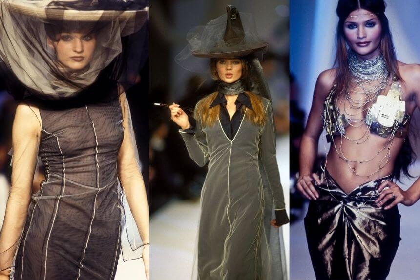 Before “witchcore” was an aesthetic, Martine Sitbon was already there. Her Spring/Summer 1993 runway sent models down the catwalk in sheer black layers, floppy witch hats, and a moody aura that screamed “Parisian enchantress.”