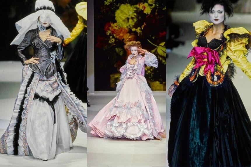 Vivienne Westwood has always dressed the rebels, the witches, and the women who refuse to apologize for existing too loudly. Her Vive la Cocotte collection from 1995 was pure haunted elegance — corseted silhouettes, powdered faces, and a flirtation with the macabre.