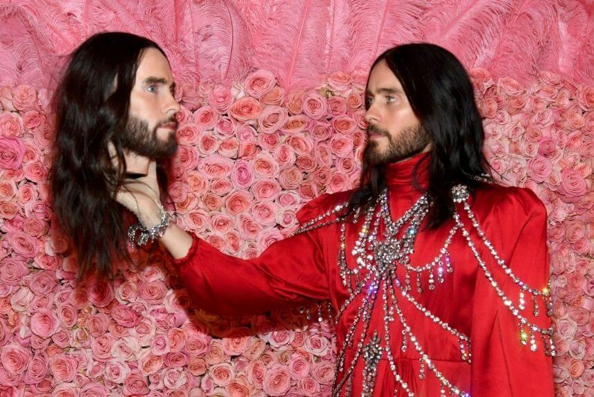 At the 2019 Met Gala, Jared Leto quite literally brought himself — carrying a life-sized replica of his own head as an accessory. The Gucci look (crimson silk, crystal chains, saintly drapery, and a decapitated prop) was equal parts Renaissance art and psychological horror.