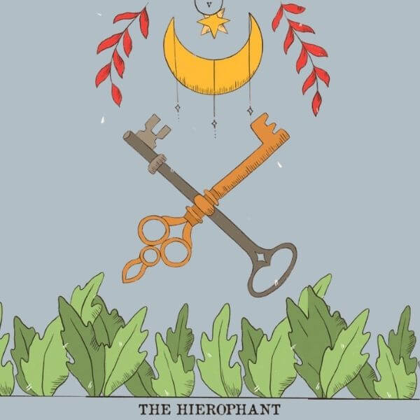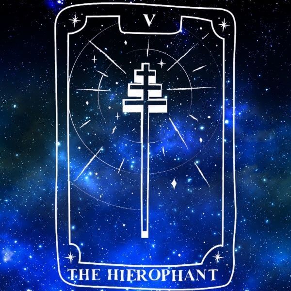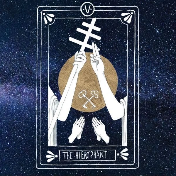 Hierophant comes from Ancient Greek. Hiero means sacred and phan means to show. So, he is “the one who makes the sacred visible.” An archetype devoted to offering and defending faith for the good of the whole. That’s why the card depicts two acolytes at his feet—those to whom he transmits knowledge. So ask yourself;