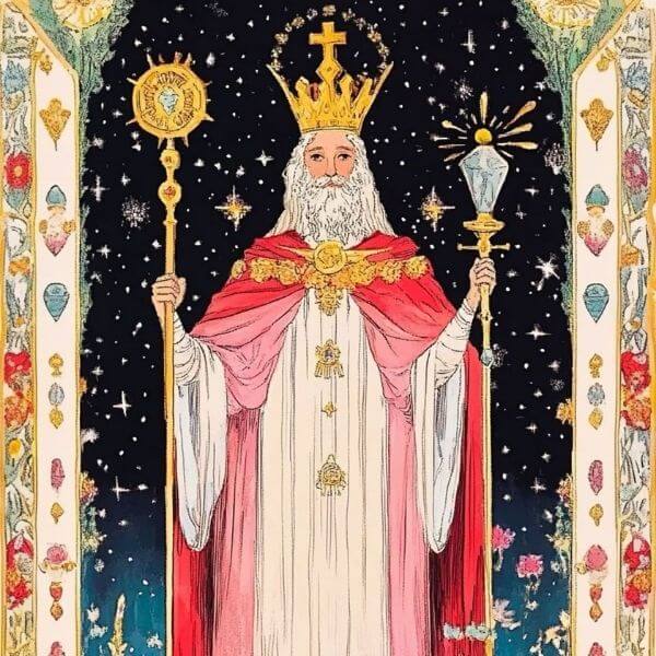 The Hierophant embodies the masculine expression of the High Priestess’s feminine principle. The masculine principle is traditionally signified by red; while the High Priestess is robed in blue, the Hierophant wears red. His vestments recall papal attire and clergy—fitting for a card that represents faith and spiritual authority.