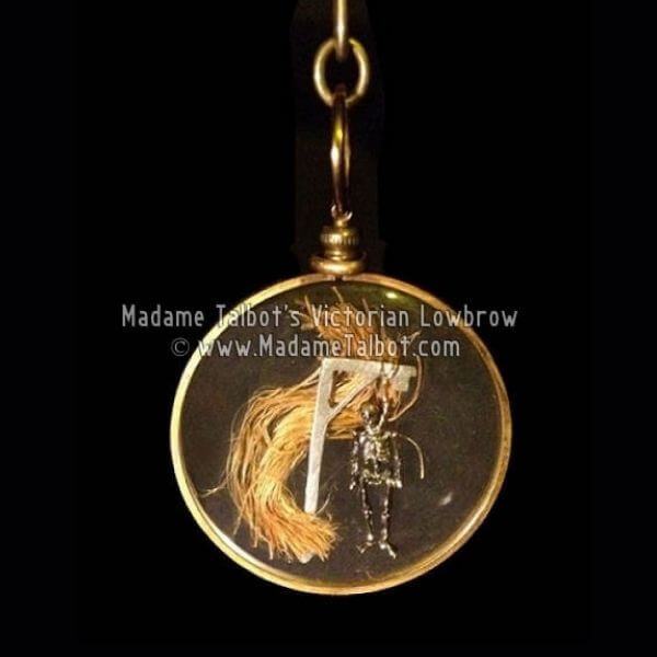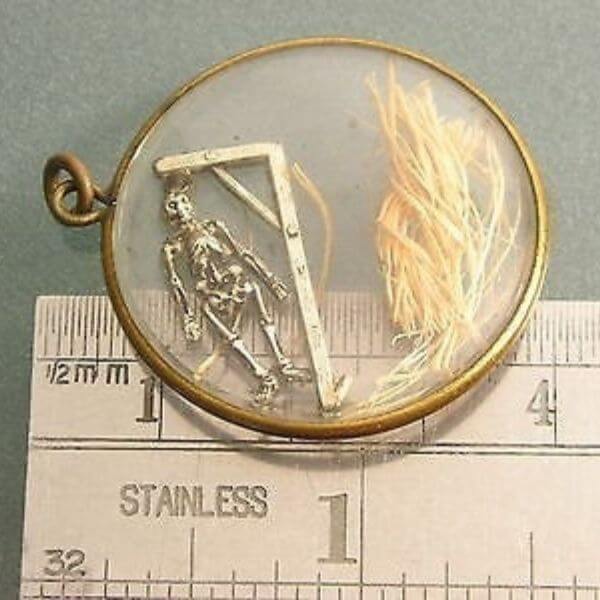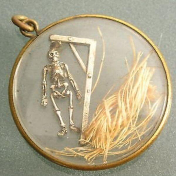 Perhaps the most morbid twist of all: the transformation of rope fragments into jewellery. These so-called “Hangman’s Lockets” were transparent glass medallions, inside which a tiny gallows and skeleton figure lay, often containing a few fibres of the actual rope used that day.